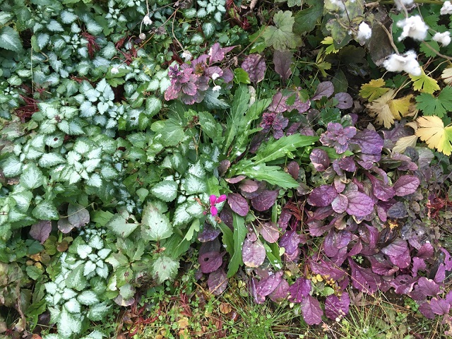 左の斑入りの葉はラミウム。むちゃくちゃ元気です。春には紫色の小さな花を咲かせてくれます。ウチのは秋にもちらほら咲かせていました。
