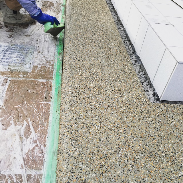 本来の洗い出し舗装は、手間がかかりますし、職人さんの腕によって