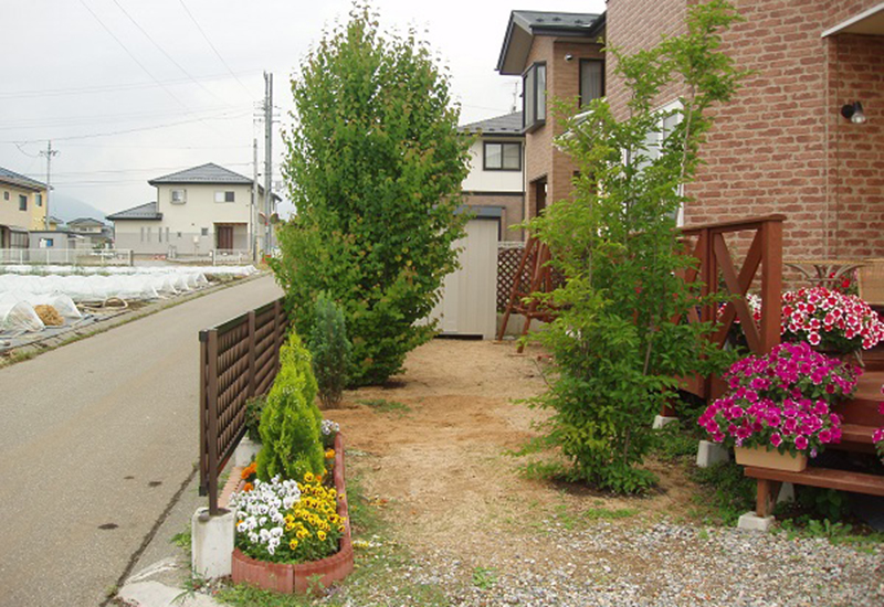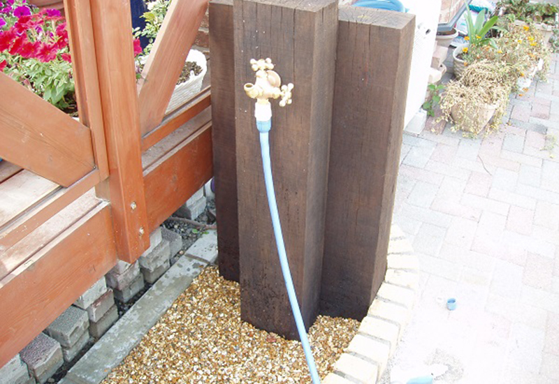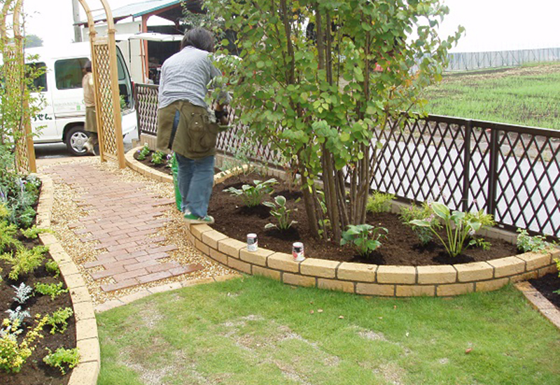 | 工事内容 | 植栽整理・ガーデニング/高低差のあるレンガ花壇施工/ウッドアーチ設置/枕木立水栓の設置/芝生・化粧砂利敷き |