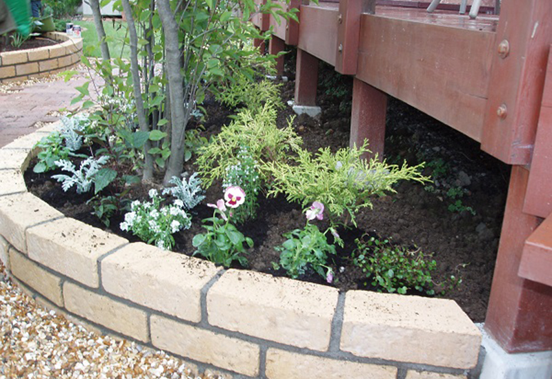 | 特徴 | ・高低差のある明るいレンガ花壇で立体感を演出 ・ウッドアーチでプライベートな入り口を演出 ・ホース常設可能な二口蛇口の可愛い枕木立水栓 ・一年草と宿根草を織り交ぜた植栽計画 |