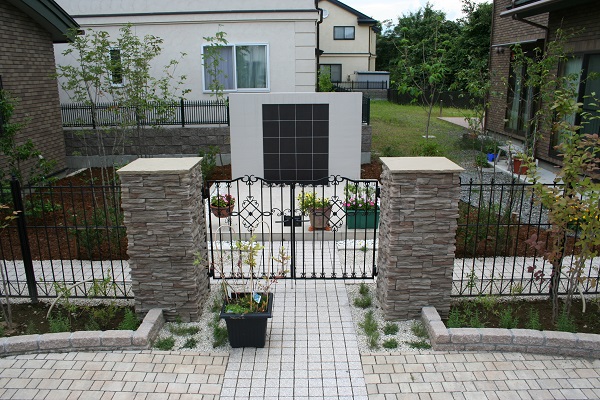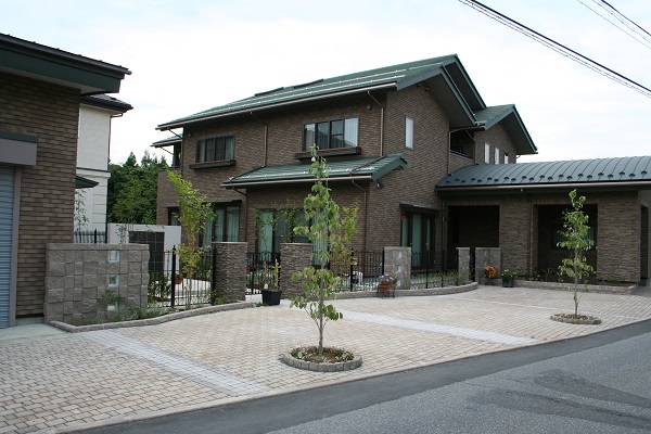 | 特徴 | ・道路沿いでもプライバシー確保 ・擬石門柱で高級感を演出 ・インターロッキングで動線整理 ・建物に調和した重厚テラス |
