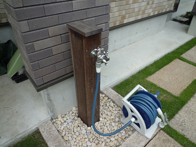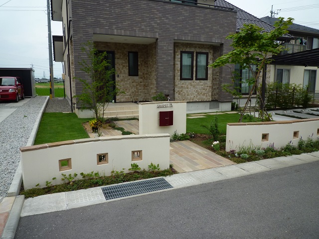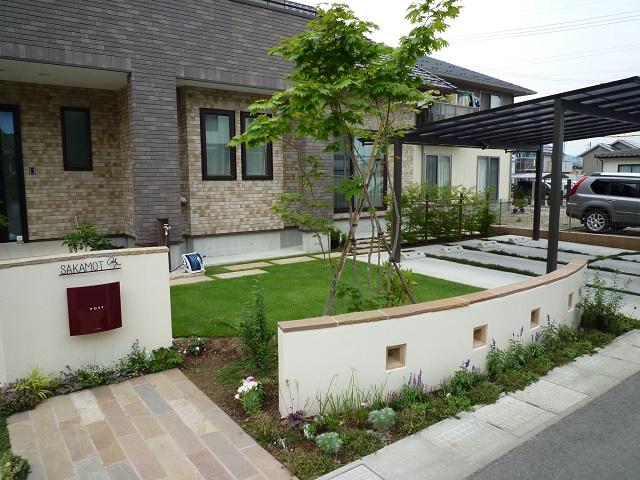 | 工事内容 | 新築外構設計/低めの塀で結界デザイン/自然石アプローチ(フォレストペービング)/塗り壁門柱・ポスト設置/芝生・外水栓・ハードウッド施工 |
