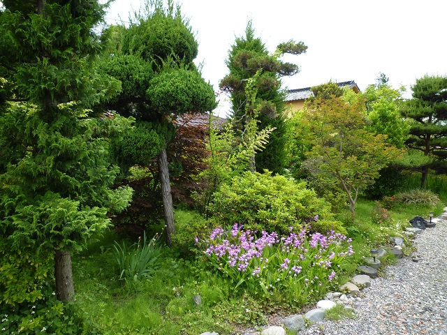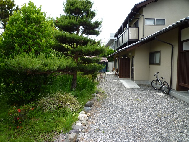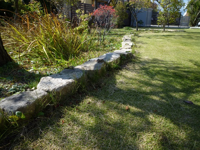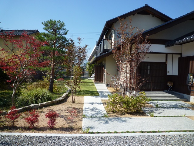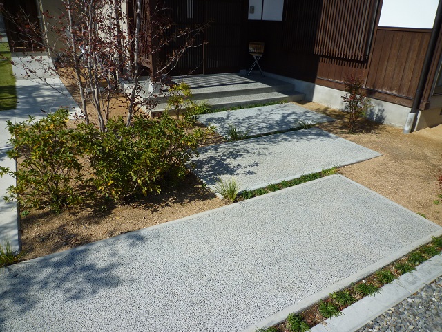 | 工事内容 | 家の建て替えに合わせた庭のリニューアル/お庭木の整理/アプローチ洗い出し舗装/芝生貼り/木曽石の花壇ボーダー設置 |