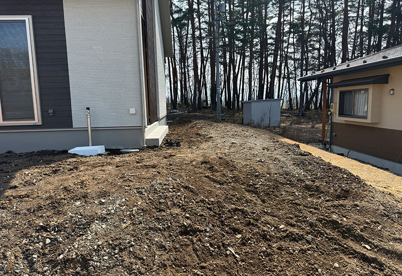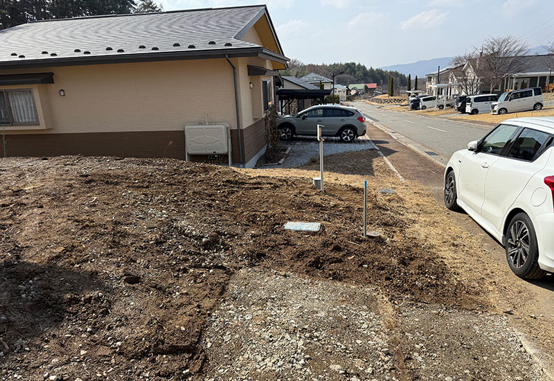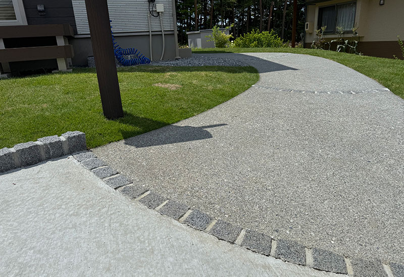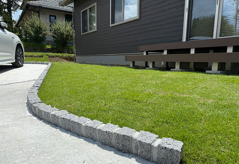 | 工事内容 | 新築の外構(外回り)全体。 天然芝の施工、ウッドデッキ、アプローチ(洗い出し仕上げ)、駐車場(土間コンクリート)。 |