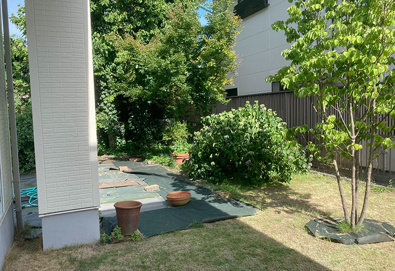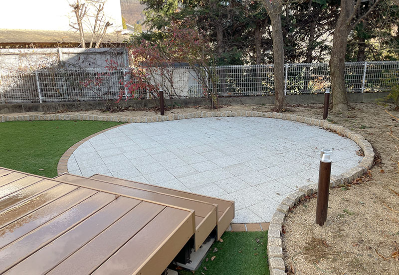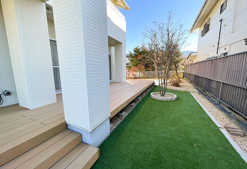 人工芝とインターロッキングによるグランドカバー、防草シートと化粧砂利による雑草対策。多目的に使える広いウッドデッキを設置。